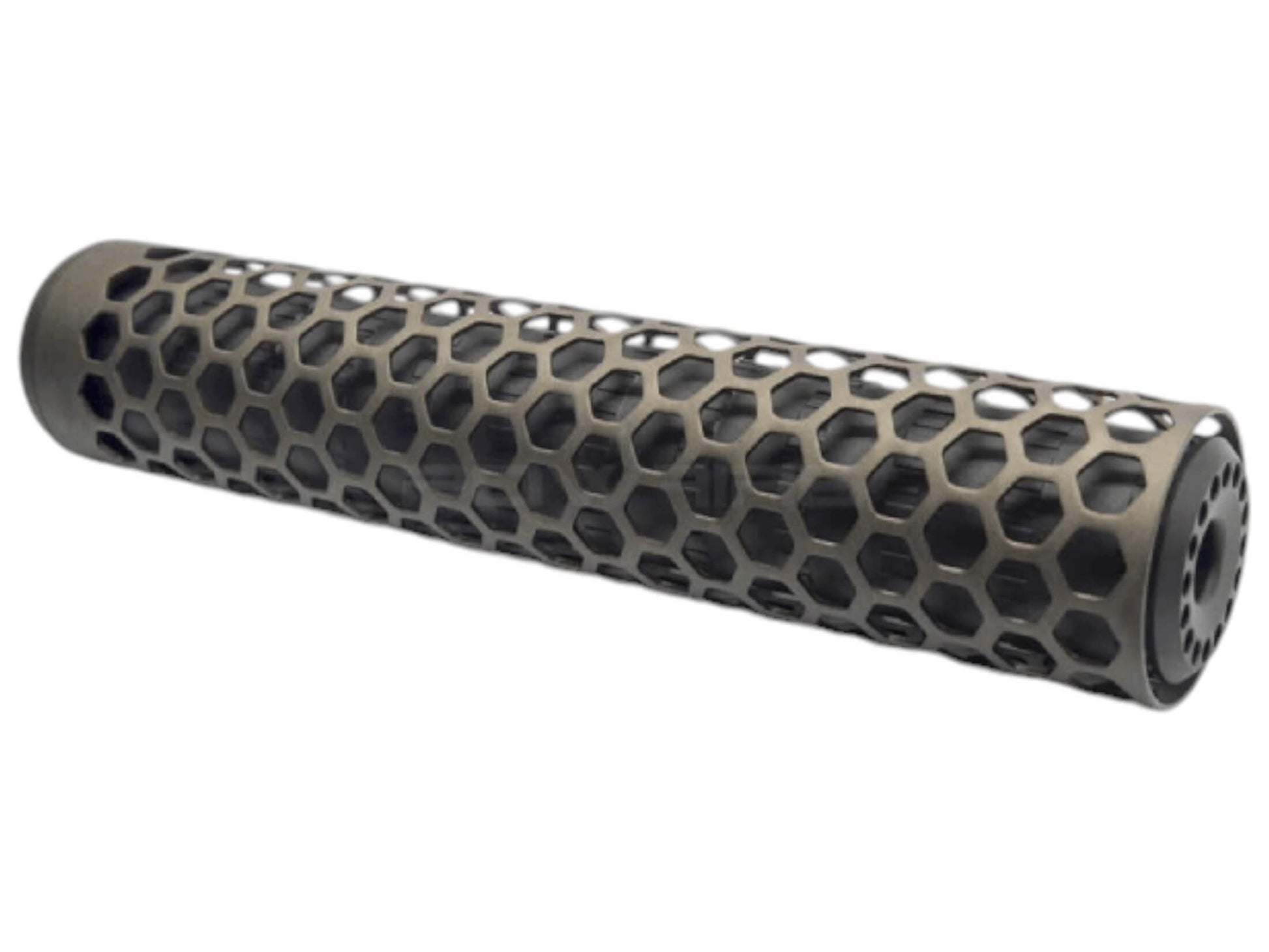Introducing the Action Army T10 HIVE Suppressor in the captivating Dark Earth color. This premium suppressor is the ultimate addition to your airsoft gear, combining exceptional performance with a stunning design that will elevate your gameplay to new heights.
